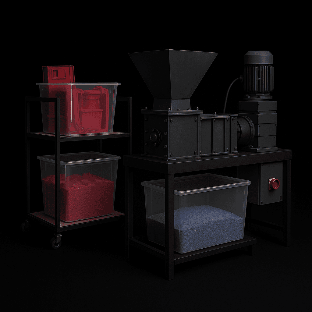 Shredding: The blades turn the plastic into small flakes, which drop into colored boxes